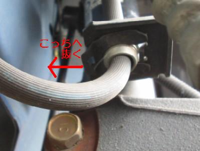 | 3) | ブレーキラインは、裏側から金具で固定されているので、 矢印の方向へ外します。 |