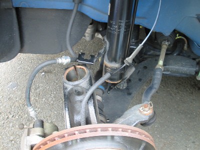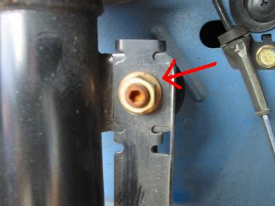 | 19) | ボルトを差込んで締めて固定します。この段階で、 ブレーキとABSのラインを元に戻してしまいます。 |