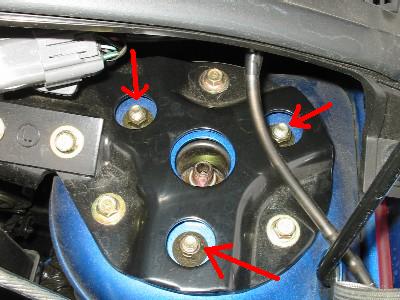 | 8) | ボンネット開けて、3ヶ所のナットを外します。最後の一個は少し緩めにしてから、 下から本体を片手で支えながら外さないと、 いきなり本体が落下しケガをする恐れがあるので、 注意しましょう。 |