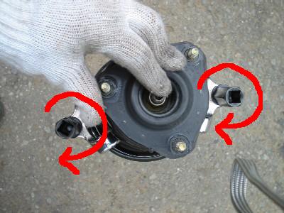 | 14) | 外した純正のバネに装着されたままのコンプレッサーを、ボルトを交互に緩めながら、 バネから取り外します。 |