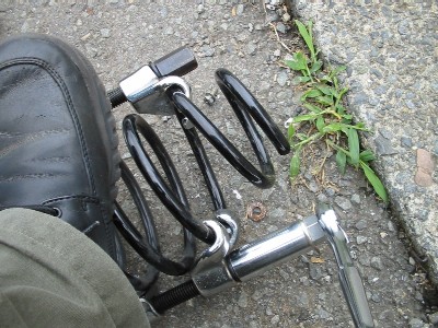 | 6) | 5)のボルトを外したら、ブレーキディスクに足を乗っけて、 ショックからすっぽ抜きます。 |