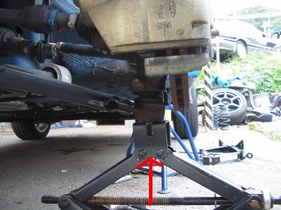 | 18) | ショックの下部をはめ込みます。外す時は足を乗っけてすっぽ抜いたのですが、 はめ込むには重たいので、 下からジャッキで徐々に持ち上げて 位置を合わせながらはめ込みました。 |