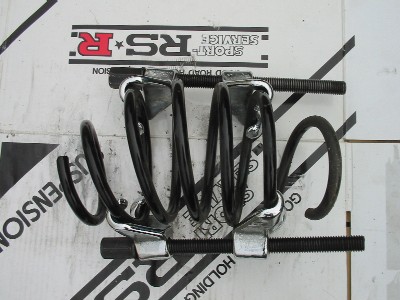 | 10) | 上から見たところです。両方のボルトを均等に少しずつ締めていくと、 徐々にスプリングが縮まっていきます。 純正のバネとはいえ、すごい反発力です。 作業は慎重にいきます。 |