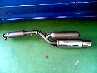| 10) | 最後にエンジンをかけて、各部排気漏れが無いか確認します。(ギアは戻してネ) 余談。写真8で解ると思いますが、真ん中のステーが ボディーの一部に干渉しています。メーカーに問い 合わせたところ、ステーの取り付け不良とのことで 新品に交換して頂くことになりました(^^)v (中古で買ったのにね) |