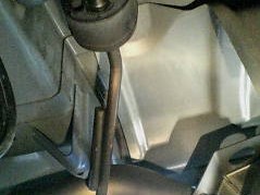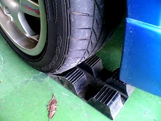 | 2) | 今回は後ろをジャッキアップするので、サイドブレーキが効かなくなります。MTだし。 安全の為、前輪に輪止めをかけ、ギアをRに 入れておきます。 ATでも事故防止のため、輪止めしましょう。 |