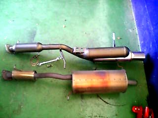 | 6) | HKSマフラーと純正マフラーを並べてみました。この時点で取り付ける向き、ステーの位置など 確認しておきます。 |
