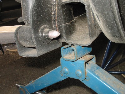 | 2) | ショックの下部のボルトを外すのですが、そのまえに下にジャッキをかましときます。 こんな感じで。 じゃ、ボルトを外します。 |